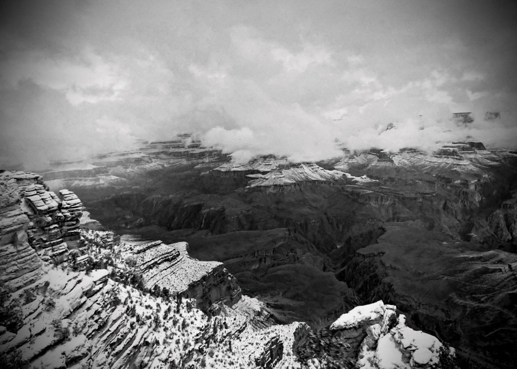The Grand Canyon is always breathtaking, but on this day, it felt almost otherworldly. A rare combination of snow and fog settled into the vast expanse, softening the canyon’s rugged edges and muting the usual fiery tones into something more ethereal. The snowfall dusted the ridges, while the fog wove through the depths like a living thing, revealing and concealing the landscape moment by moment. It was a fleeting scene, one that few ever get to witness, and I knew I had to capture it before it disappeared into the silence.